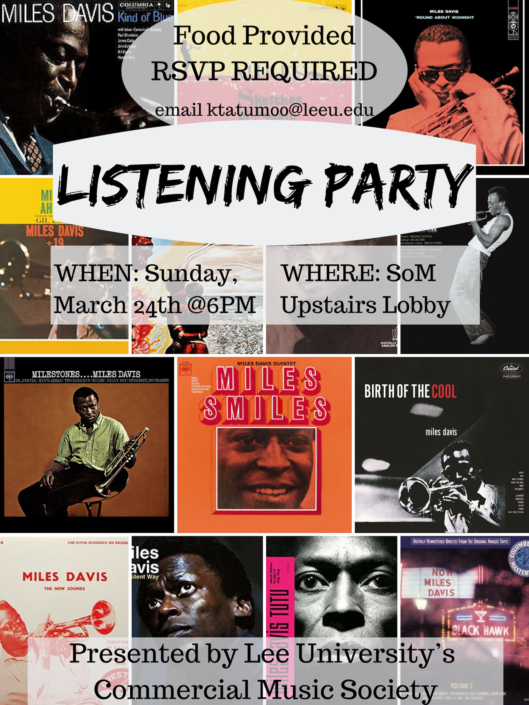 The Commercial Music Society will be hosting a Miles Davis listening party on Sunday, March 24. The event will be held in the upstairs lobby of the School of Music at 6 PM. For more information about this event or the Commercial Music Society in general, please contact Kirsten Tatum at ktatum00@leeu.edu.