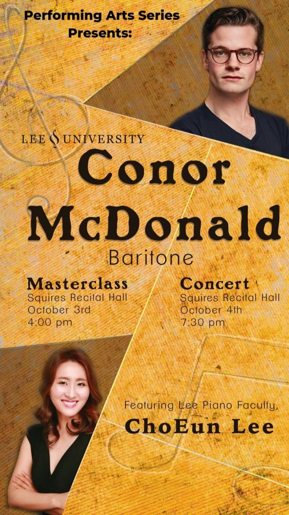 Mr. McDonald will be giving a free Masterclass on Thursday, October 3rd at 4:00pm. The concert will take place Friday, October 4th at 7:30pm. Both events will take place in Squires Recital Hall at Lee University.
