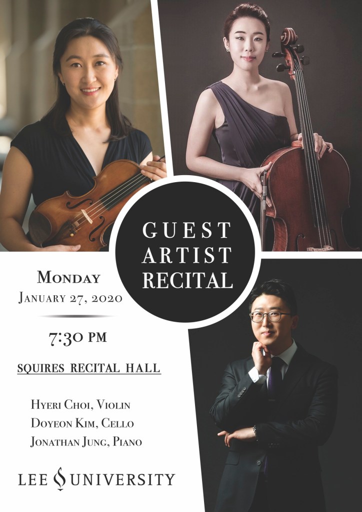 Join us next Monday for a thrilling recital, featuring Hyeri Choi on the violin, Doyeon Kim on the cello, and our very own Dr. Jonathan Jung on the piano. The recital will be in Squires recital hall at 7:30. We are excited to see you all there!