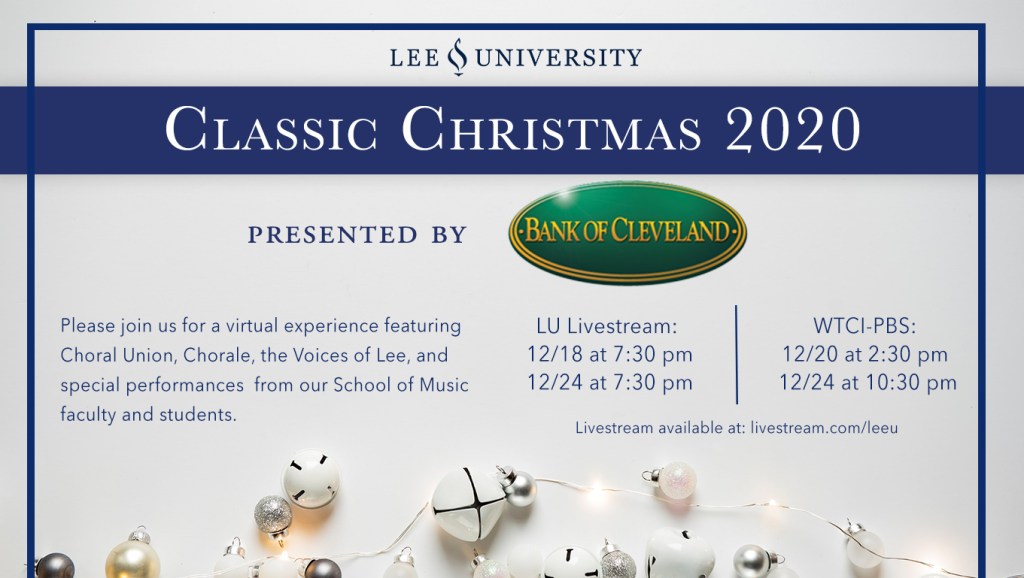 Lee University and Bank of Cleveland will present a virtual rendition of the annual “A Classic Christmas”. This highly anticipated event will feature performances by several School of Music ensembles, students, and faculty. “A Classic Christmas” will include a variety of traditional Christmas songs, such as “Joy to the World,” “Silent Night,” “Mary Did You Know,” “I’ll be Home For Christmas,” and “Hark the Herald Angels Sing.”