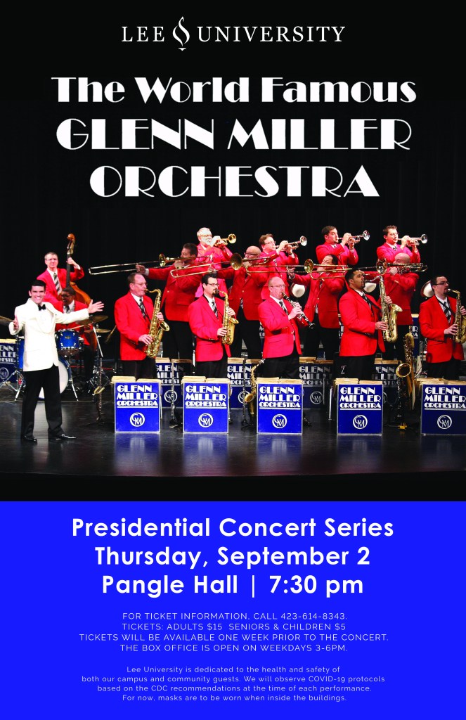 We’re delighted the welcome the famous Glenn Miller Orchestra to Lee University for a Presidential Concert Series performance this Thursday, September 2nd! The concert will be held in Pangle Hall at 7:30pm. Contact the box office for tickets!